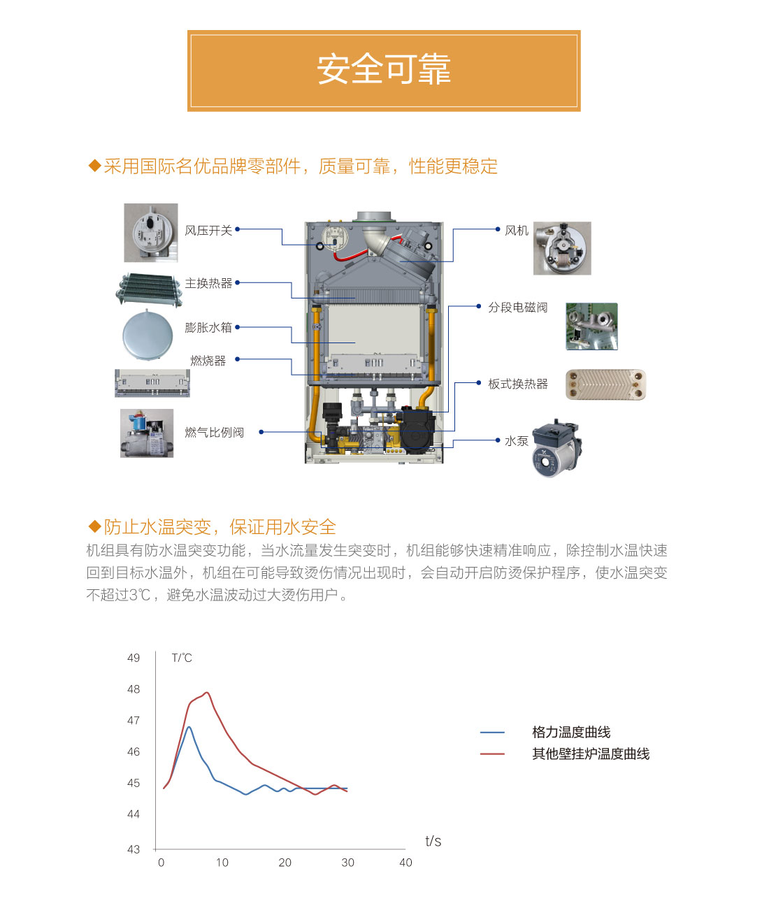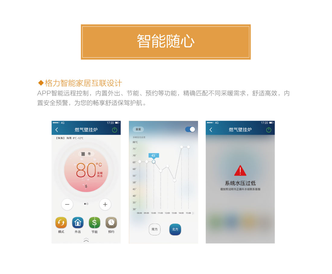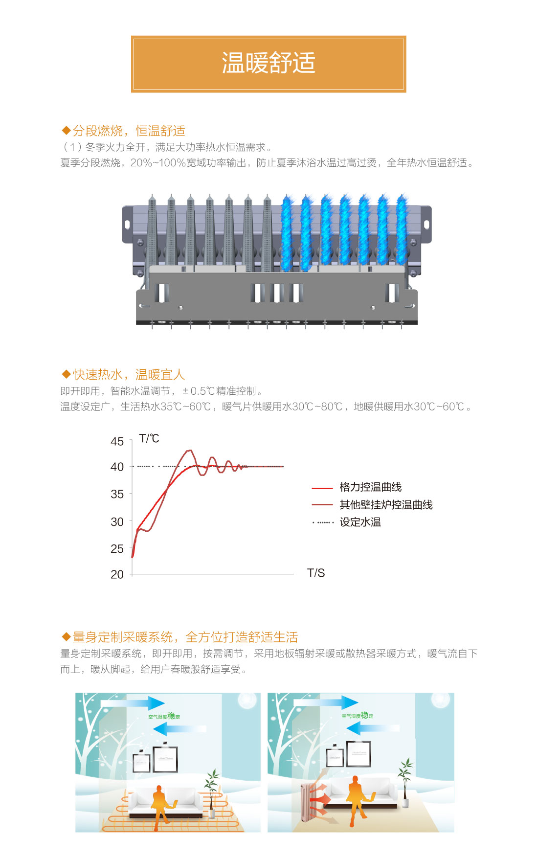 分段燃燒,20%~100%寬域功率輸出,防止夏季水溫過高過燙,智能水溫調(diào)節(jié),±0.5℃精準控溫,溫度設定廣,生活熱水35℃~60℃,暖氣片供暖用水30℃~80℃,地暖供暖用水30℃~60℃