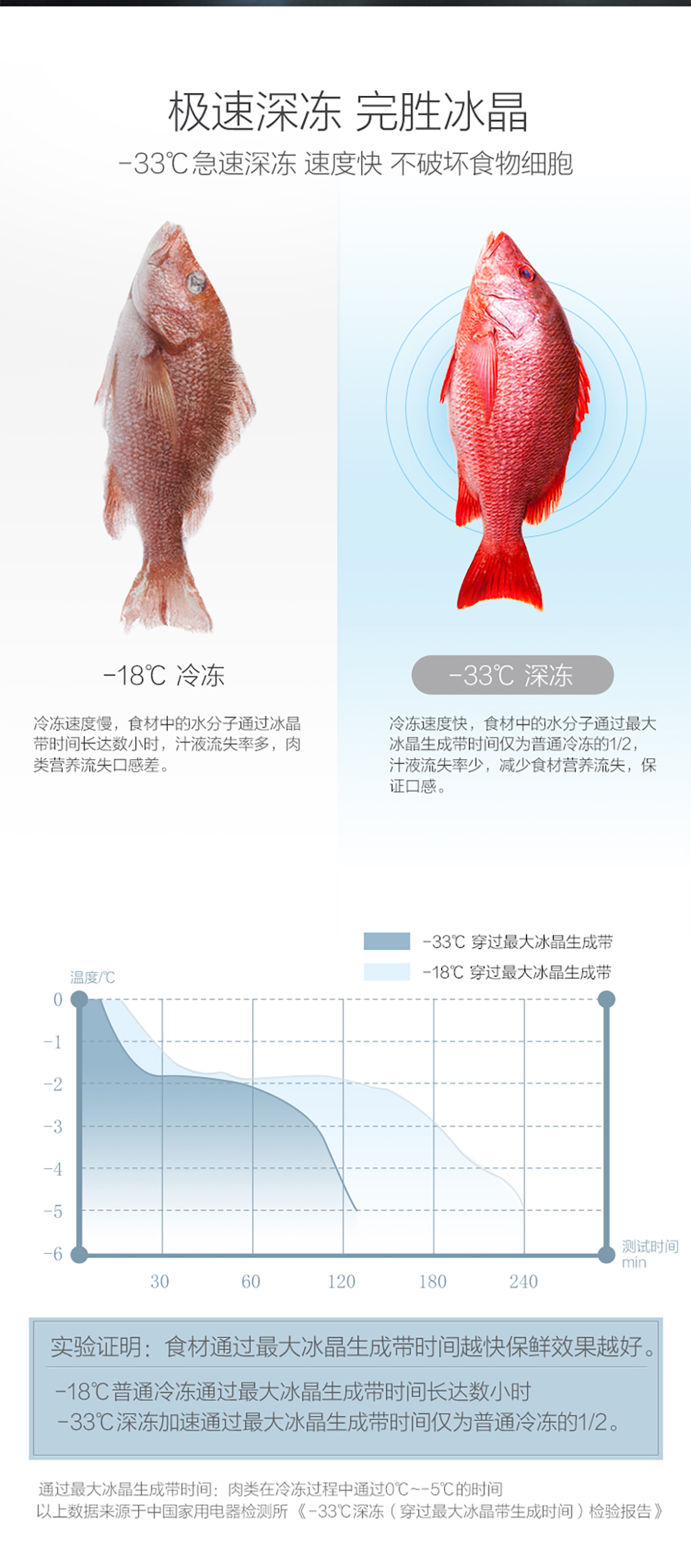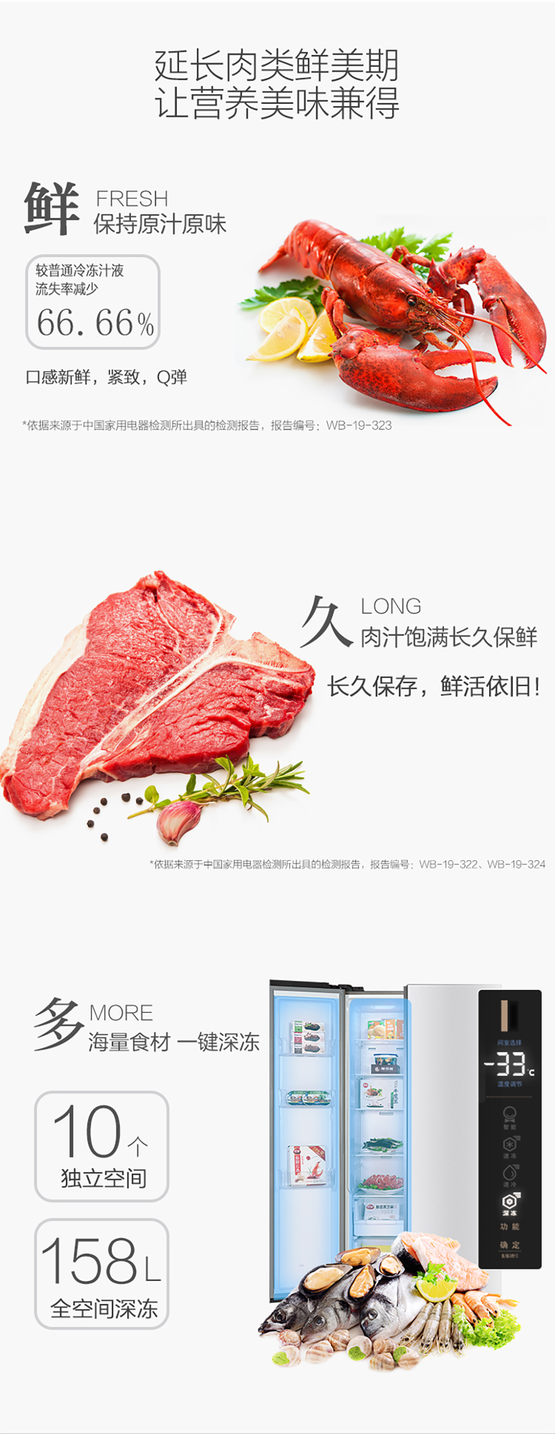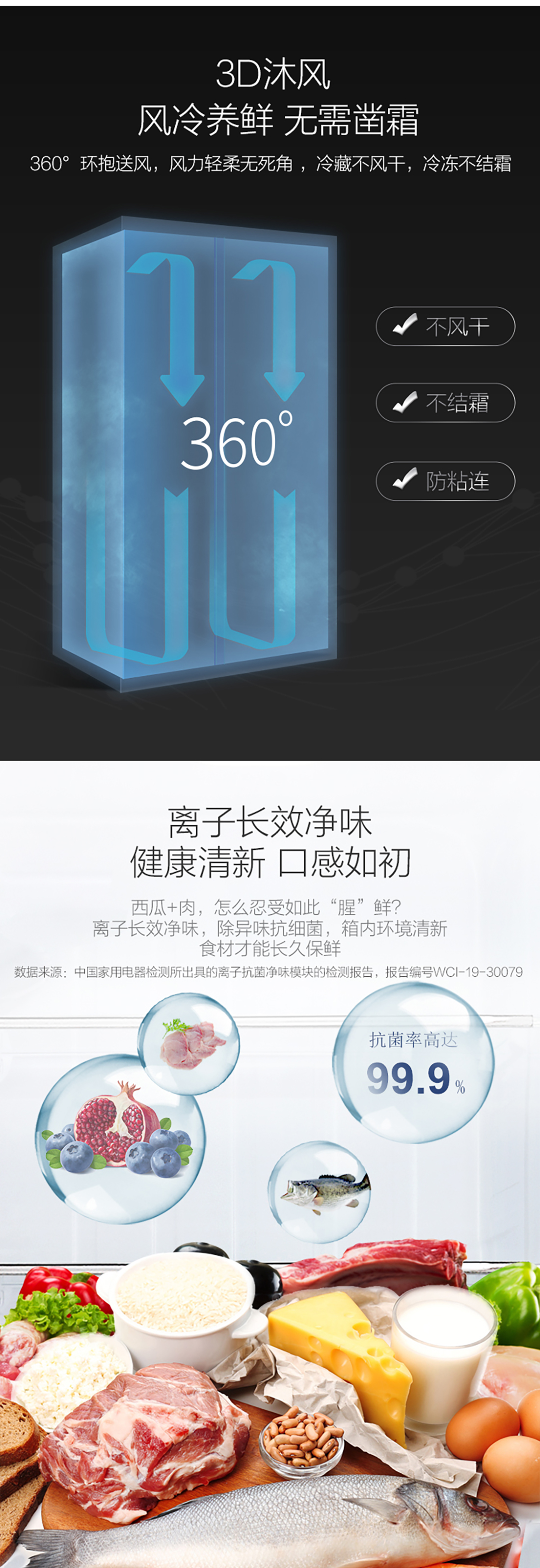 搭載-33℃深凍鎖鮮科技,肉汁飽滿(mǎn)更長(zhǎng)久。采用離子長(zhǎng)效抗菌凈味,抗菌率高達(dá)99.9%。3D沐風(fēng),風(fēng)冷養(yǎng)鮮,無(wú)需鑿霜。